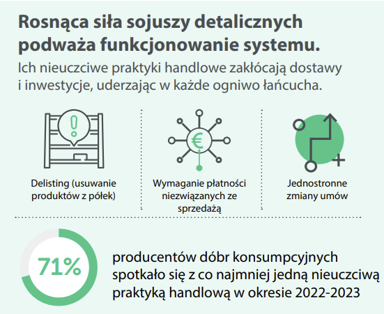 Siła sojuszy zakupowych i stosowanych przez nie praktyk handlowych jest na tyle znacząca, że problem nie jest już tylko sporem o bardziej lub mniej zrównoważoną umowę handlową. Kiedy całe branże sektora rolno-spożywczego muszą, kosztem swojej rentowności, udzielać coraz większych rabatów i pokrywać koszty funkcjonowania sieci, zostaje im coraz mniej środków na inwestycje, badania i rozwój, zrównoważoną produkcję czy podwyżki dla pracowników. W efekcie spada innowacyjność, maleje liczba miejsc pracy w przetwórstwie i rolnictwie, a Europa traci konkurencyjność wobec krajów trzecich, w których koszty są dużo niższe. Długoterminowo grozi to naruszeniem bezpieczeństwa żywnościowego całej UE i uzależnieniem od importu z krajów trzecich. Uczciwe warunki handlowe w obecnych, bardzo trudnych warunkach gospodarczych to nie tylko „ochrona słabszych” – to warunek przetrwania i rozwoju całego europejskiego łańcucha wartości produkcji żywności.